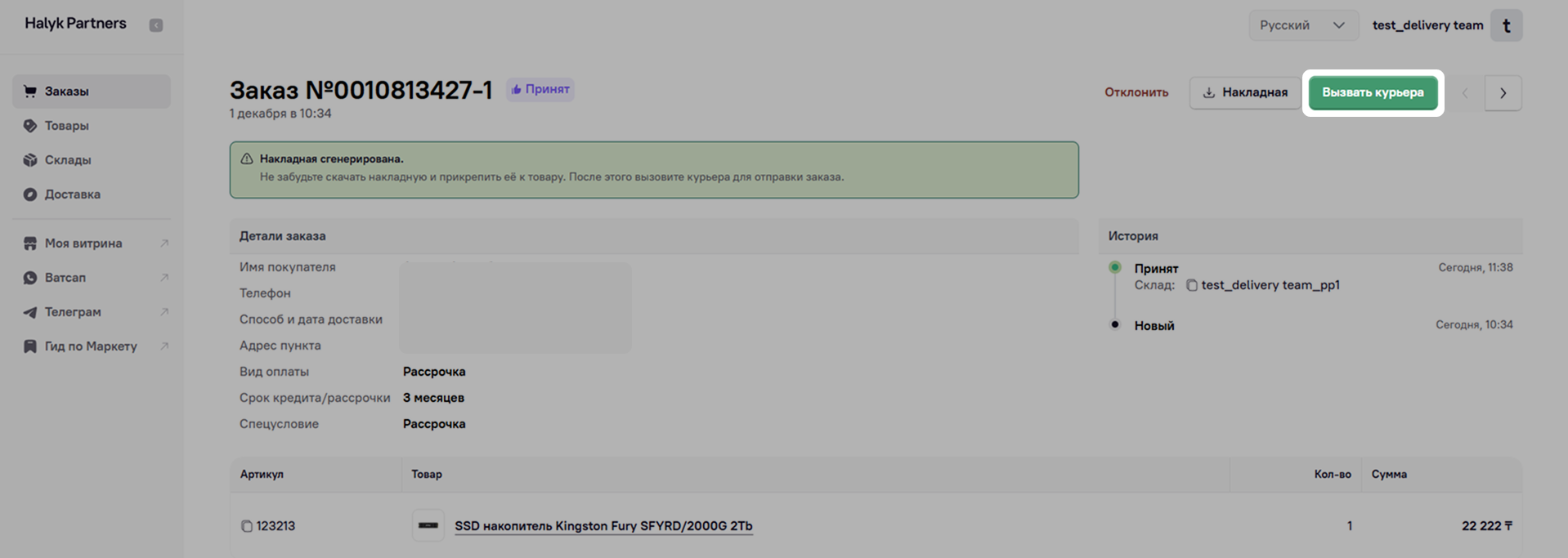 После того, как подготовили заказ, нажмите на кнопку Вызвать курьера.