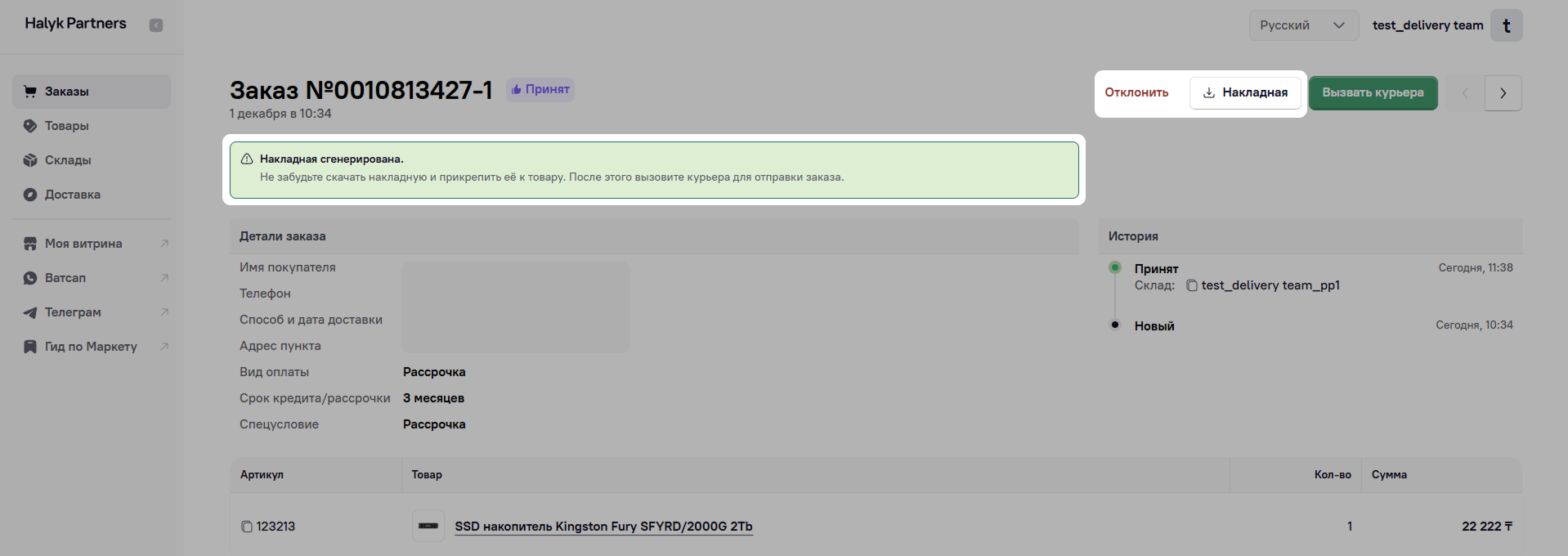 Распечатайте созданную накладную. При необходимости вы можете нажать на кнопку Отклонить для отмены заказа.