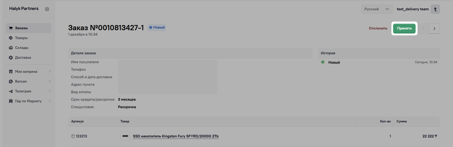Свяжитесь с покупателем, чтобы уточнить детали по заказу. Примите заказ, нажав на кнопку Принять.