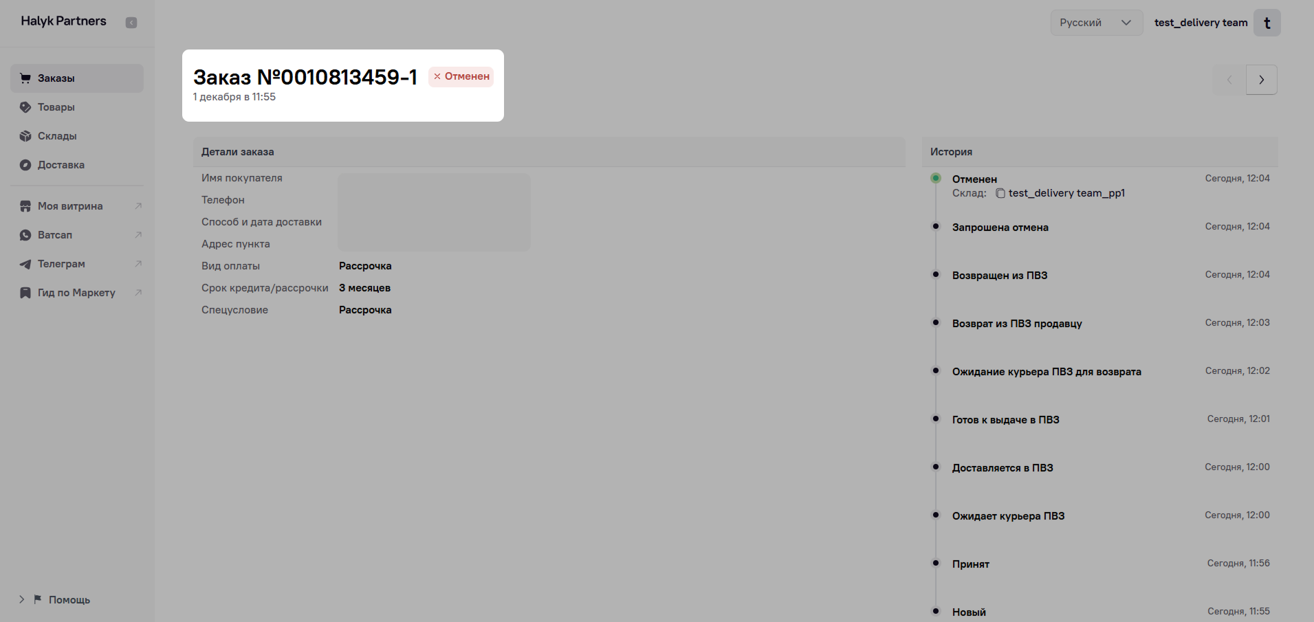 После заказ переходит в окончательный статус — Отменен.