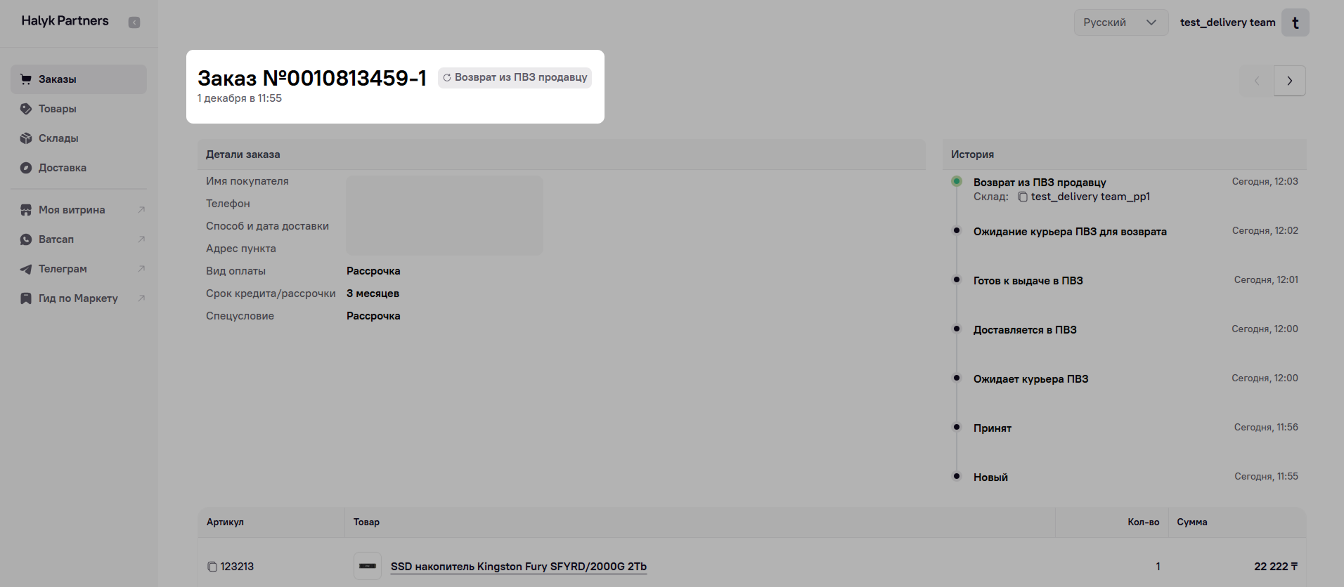 Далее заказ перейдет в статус Ожидает курьера ПВЗ.