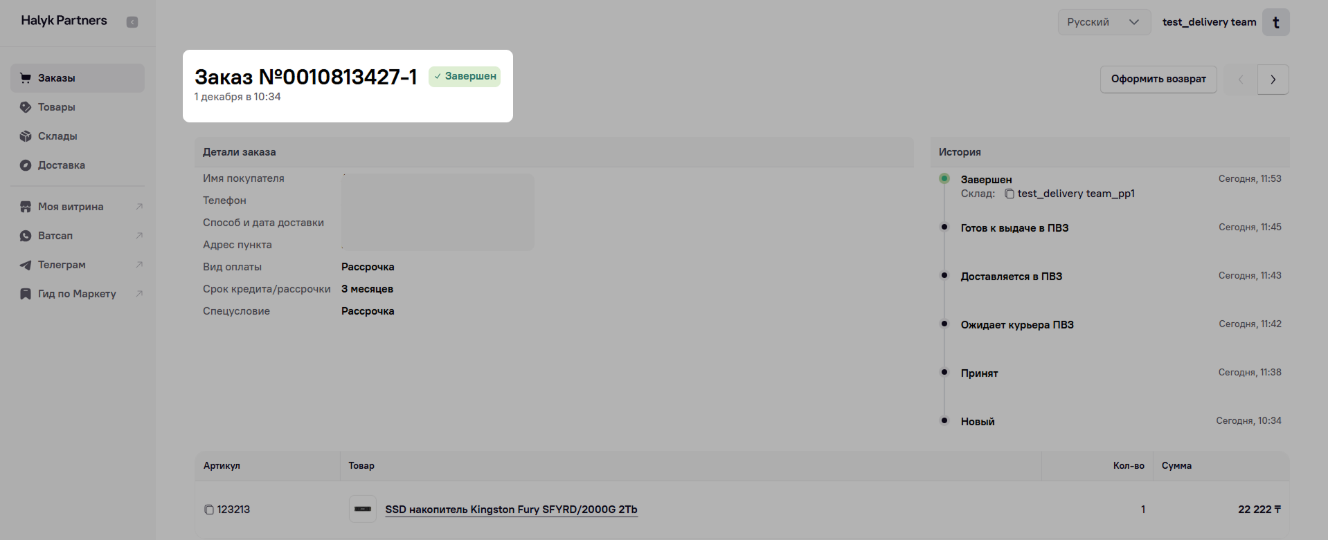 Как только клиент успешно получил заказ из ПВЗ, он перейдет в статус Завершен.
