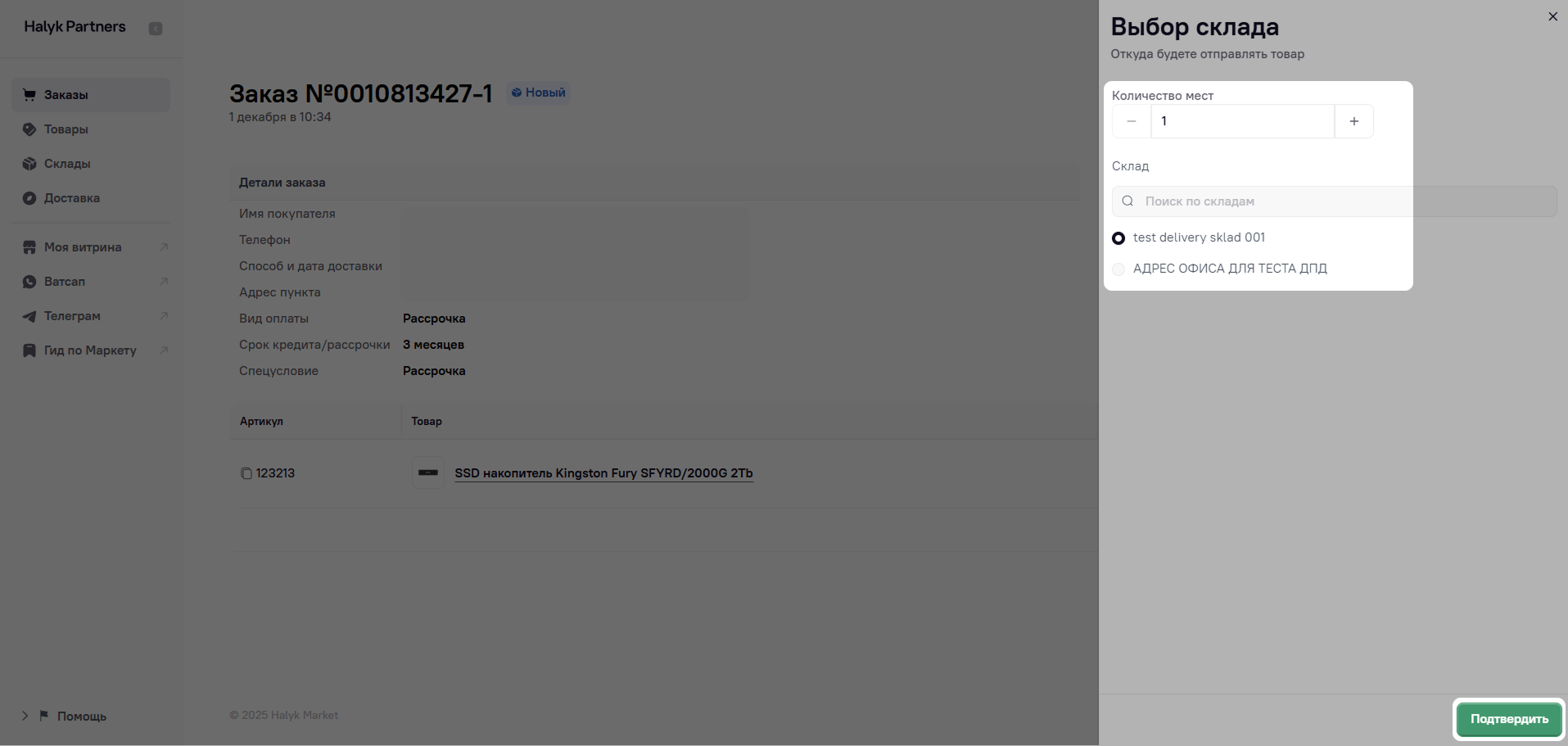 Выберите склад, с которого курьер заберет заказ, и укажите количество мест в заказе.