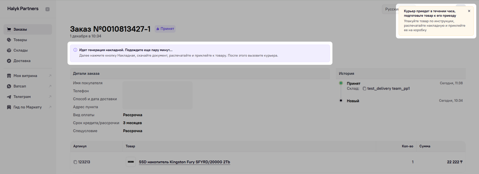 Заказ перейдет в статус Принят. Пока идет генерация накладной, подготовьте заказ к доставке. Упакуйте товар согласно правилам упаковки.