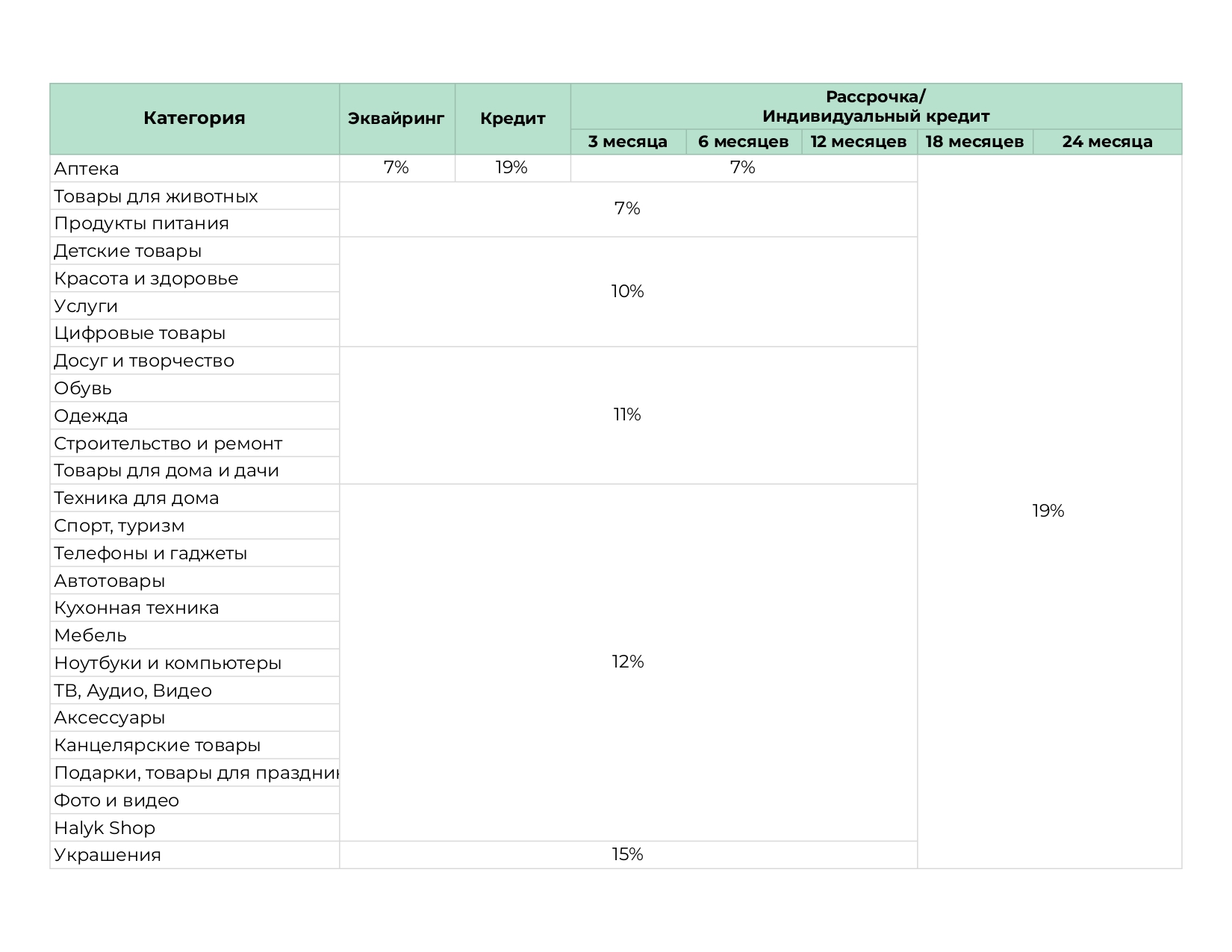 При оформлении рассрочки или кредита на 18 или 24 месяца всех категорий, кроме «Продукты питания», комиссия единая — 19%. Для категории Аптека при покупке в кредит действует комиссия — 19%.