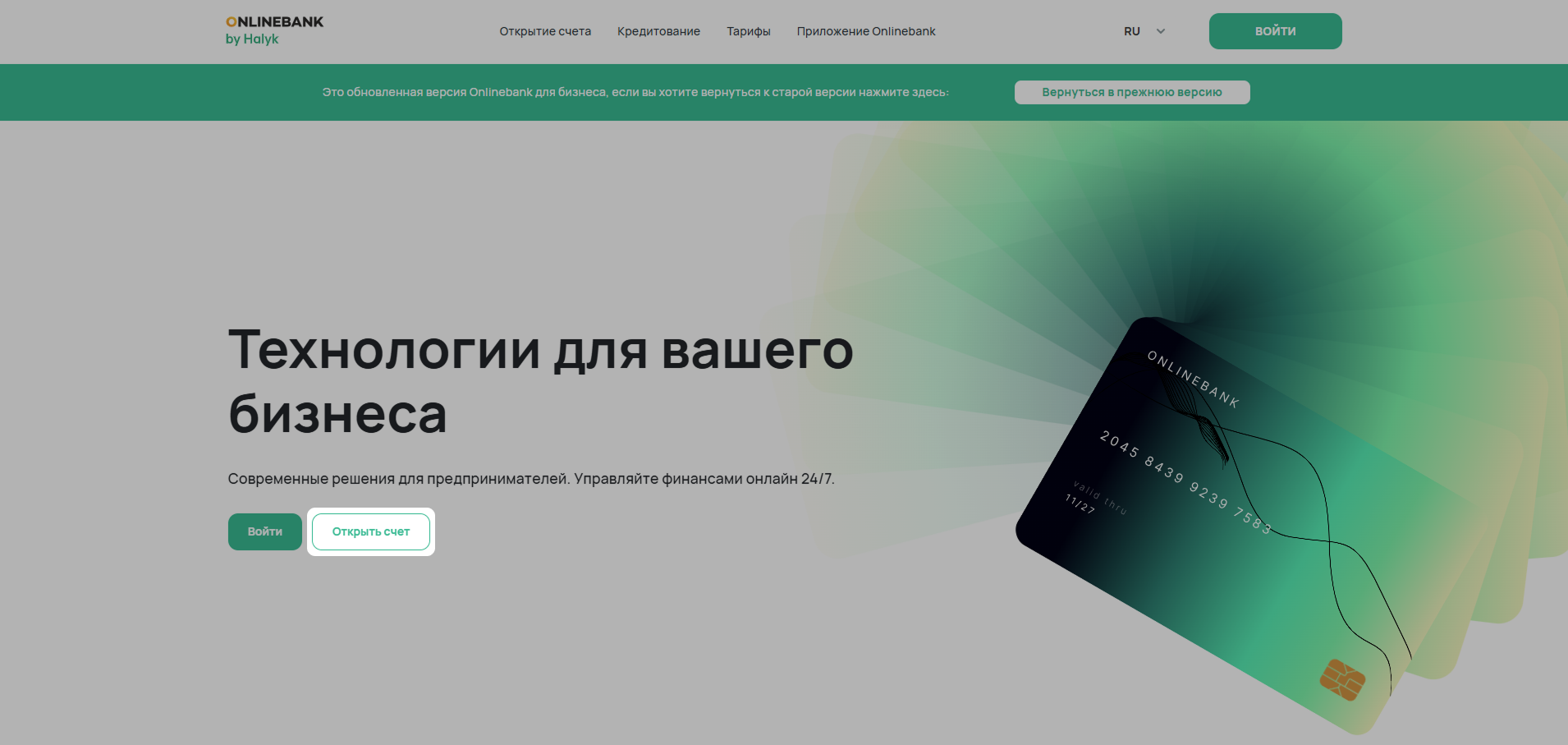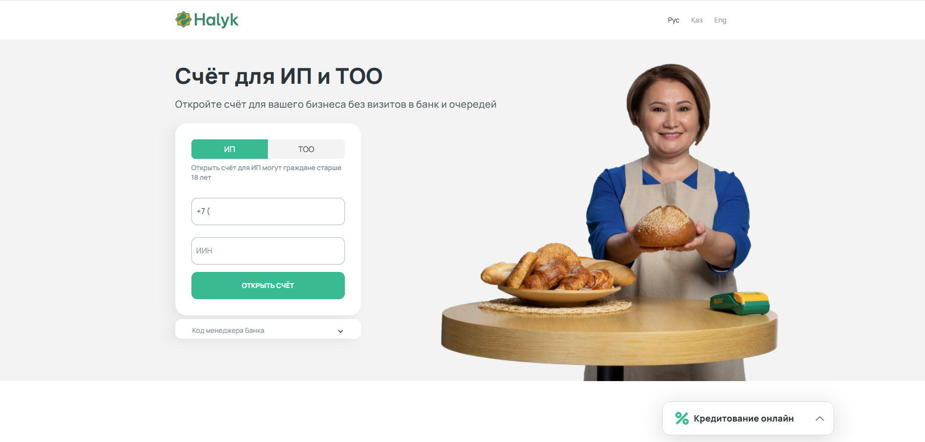 Для регистрации через Onlinebank необходимо, чтобы у вас был счет в Halyk Bank. Если у вас нет счета в Halyk Bank, нажмите на кнопку Открыть счет.