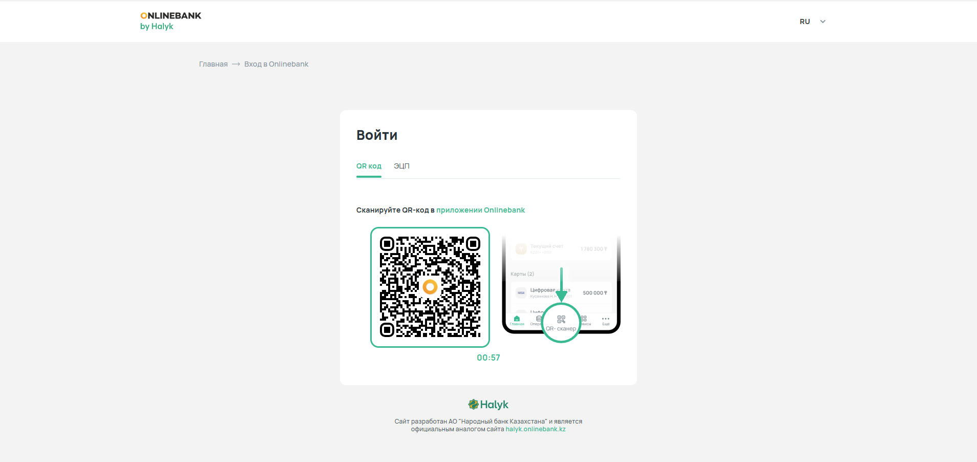 Следующим шагом, после нажатия на кнопку Войти, авторизуйтесь одним из двух способов: с помощью QR-кода или ЭЦП.