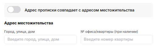 Если адрес вашего фактического проживания отличается от адреса прописки, переведите переключатель вправо. А затем введите адрес вашего фактического проживания.