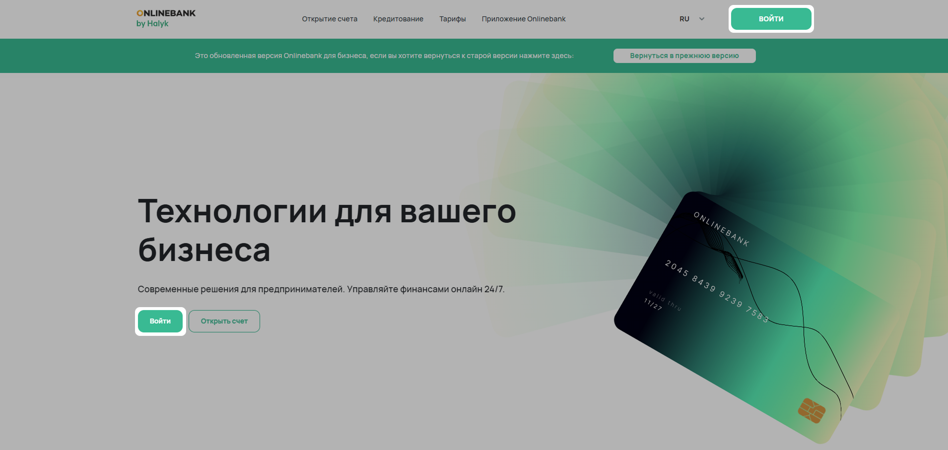 Для начала скачайте приложение Onlinebak и пройдите регистрацию, если ранее этого не делали. Далее перейдите на сайт Onlinebank и нажмите на кнопку Войти.