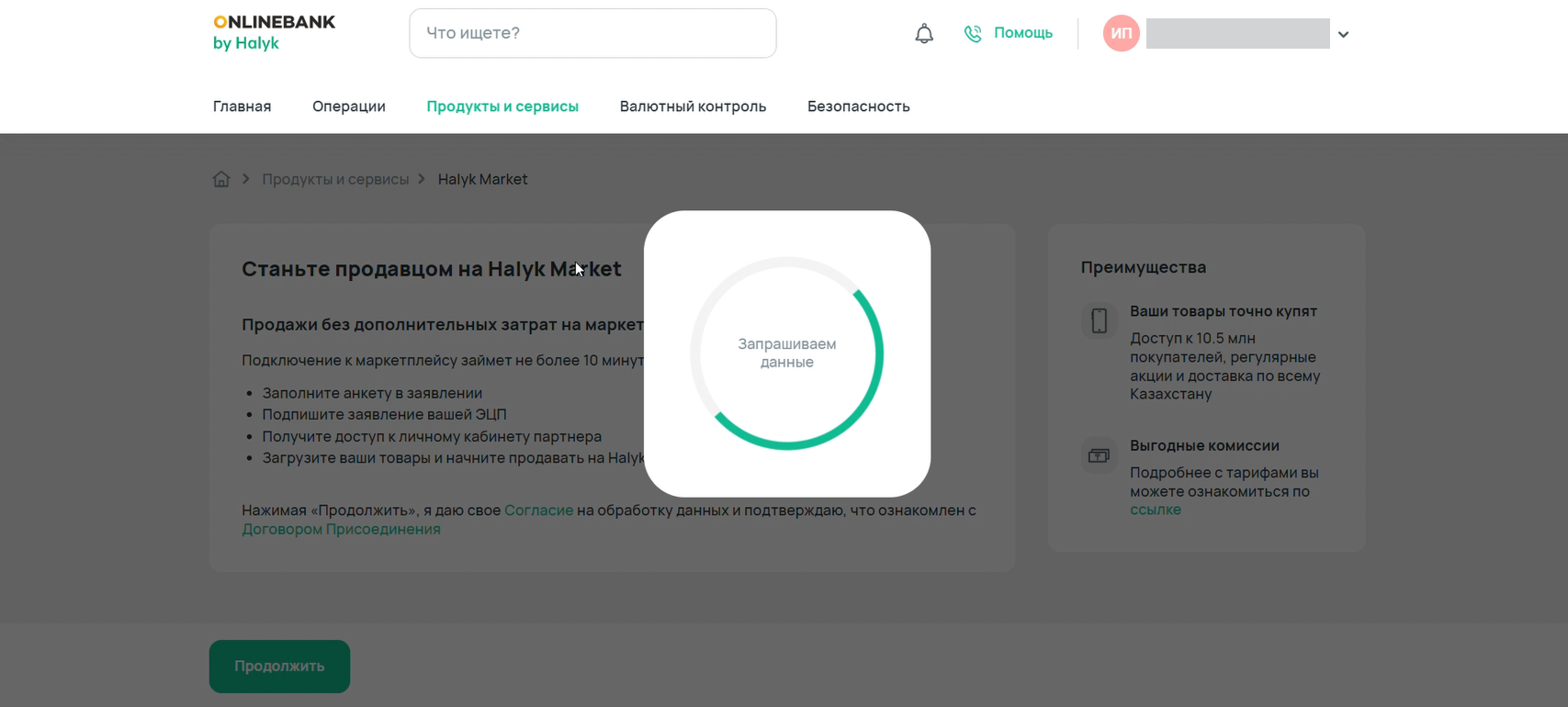 Ознакомьтесь с информацией на странице и нажмите на кнопку Продолжить. Нажимая Продолжить, вы соглашаетесь на обработку данных и подтверждаете, что ознакомлены с Договором присоединения.
