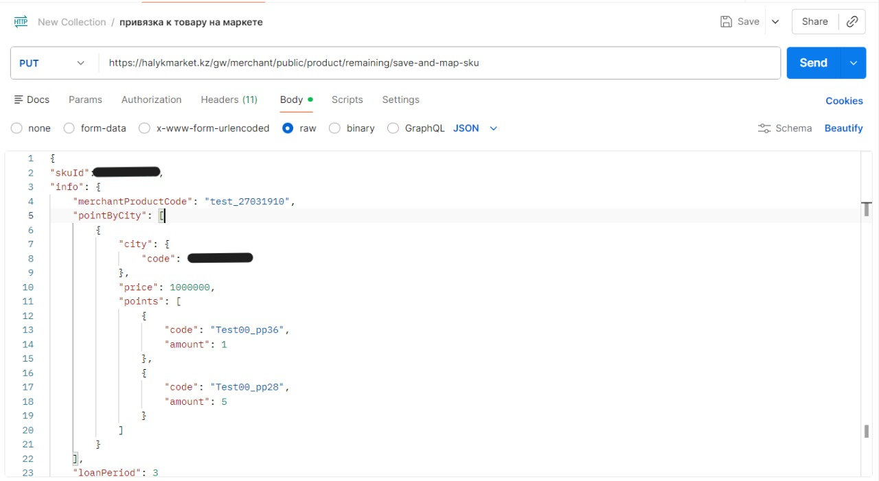 На этом этапе выполняется непосредственная привязка вашего товара к существующему товару на Halyk Market по ранее найденному skuId. Этот запрос связывает ваш внутренний товар (собственный артикул, склад, цену и остатки) с карточкой товара на маркетплейсе.
