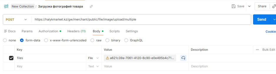 Этот шаг отвечает за загрузку изображений товара на сервер Halyk Market через API. Вы отправляете фотографии в виде файлов через POST-запрос, и в ответ получаете данные о загруженных изображениях (их ID и ссылки), которые понадобятся на следующем шаге при сборе формы товара.