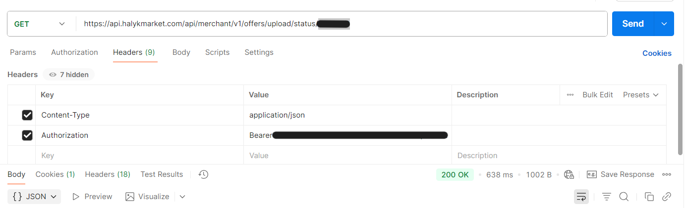 Для обращения на тестовый сервер используйте URL: https://test2-api.halykmarket.com/api/merchant/v1/offers/upload/status